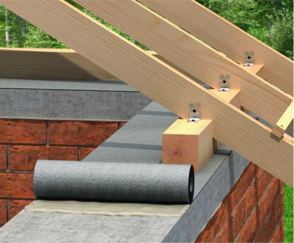 Обычно мауэрлат изготавливают из бруса сечением 150×100 (150) мм. Его укладывают вдоль внутреннего края стены на гидроизоляционный материал, которым может служить двойной слой рубероида или полиэтилена. От наружных атмосферных воздействий мауэрлат защищают, если дом каменный – рядом кирпичной кладки, если деревянный – тем же слоем гидроизоляционных или облицовочных материалов. Брусья мауэрлата по периметру скрепляют между собой в единую конструкцию, выпиливая на половину толщины бруса отрезки длиной 100-150 мм. и соединяя их болтами или гвоздями. К деревянным стенам мауэрлат крепят металлическими скобами, к стенам из кирпича, пено- и газосиликатных блоков – с помощью резьбовых шпилек диаметром порядка 12-16 мм., замоноличеных в устроенный по верху стены железобетонный пояс. Шпильки располагают по периметру на расстоянии 1500—2000 мм., в брусе конструкции высверливают под них отверстия.