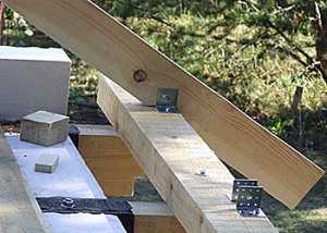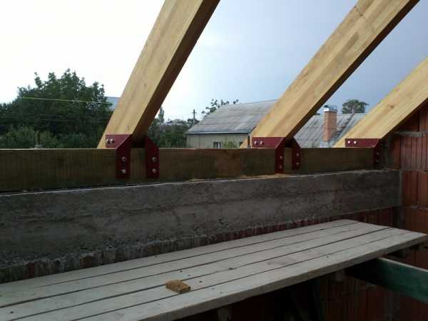 - способом обрезки торцов стропил под углом (верхние торцы бруса обрезаются для получения вертикального стыка, для обеспечения прочности узла применяют крепёжные пластины или деревянные накладки)