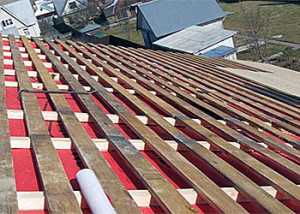 100 мм. Стык досок обрешётки должен приходиться на опорах и расстояние между их торцами не должно превышать 5 мм. Доски, формирующие конёк (верх стропильной системы), должны находиться максимально близко друг к другу. Тип обрешётки выбирается исходя от вида настилаемой кровли. Для мягких, черепичных и рулонных кровель требуется выполнять сплошной настил. Иногда требуется устройство двухслойного настила, в этом случае первый слой досок располагается параллельно коньку, второй – перпендикулярно, вдоль ската крыши. Для шиферных и металлических кровель вполне подойдёт обрешётка с шагом досок, соразмерным с габаритами используемого материала.