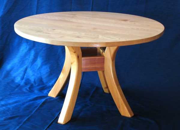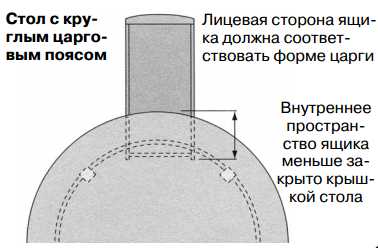 Установка выдвижного ящика в круглом столе вполне возможна. Но если царговый пояс имеет квадратную или прямоугольную форму, то надо быть готовым, что доступ внутрь ящика будет ограниченным. Если же царговый пояс округлый, то передняя панель ящика должна изготавливаться так (например, слоисто-гнутая или блочно-клееная конструкция), чтобы ее форма соответствовала форме царги.