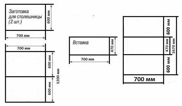 Для увеличения площади столешницы используется специальная вставка, ее размеры и размеры всего стола можно посмотреть на этой схеме.
