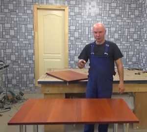 Если вы полностью делаете стол с нуля из своих материалов, вам понадобится циркулярная пила, электролобзик, дрель и шуроповерт. Порядок сборки в принципе такой же, как и обычного стола, только дополнительно изготавливается раздвижная конструкция для вставки из аллюминиевых уголков, а также на средней части столешницы дополнительные петли и защелки.