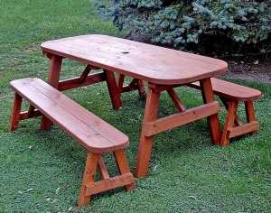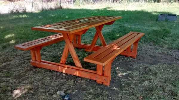 Для изготовления такого садового стола из дерева своими руками потребуется больше времени, так как в комплекте с ним идут скамейки