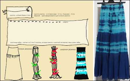 Метод создания этой техники заключается в последовательном складывании или завязывании материала с последующим нанесением красителя, при этом в некоторые места связанные узлами краситель не попадает и создаст интересные и красивые узоры, а также переливы цветов.