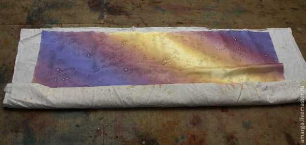 В этой технике можно окрашивать не весь отрез, а только часть. В процессе кипячения можно оставить один край не окрашенным, закрепив его над емкостью с красителем. В результате переход от цветной части к неокрашенной получится мягким. Затем на неокрашенном участке можно выполнить роспись в любой технике.