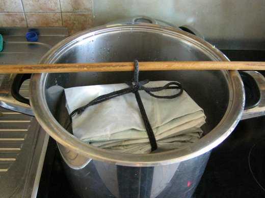 Обычно окрашенные вещи закрепляют паром. Причем процесс кажется муторным, но на самом деле ничего сложного нет. Ткань сворачивают в кальку и подвешивают в большой емкости с небольшим количеством воды. Накрывают плотным полотенцем во избежание попадания капель конденсата с крышки и ставят на огонь. До полутора часа изделие обрабатывается паром, затем просушивается. Некоторые краски все же можно просто пропарить утюгом, производители обычно указывают на этот способ, но домашние рукодельницы утверждают, что старые традиции сохраняют насыщенность цветов.