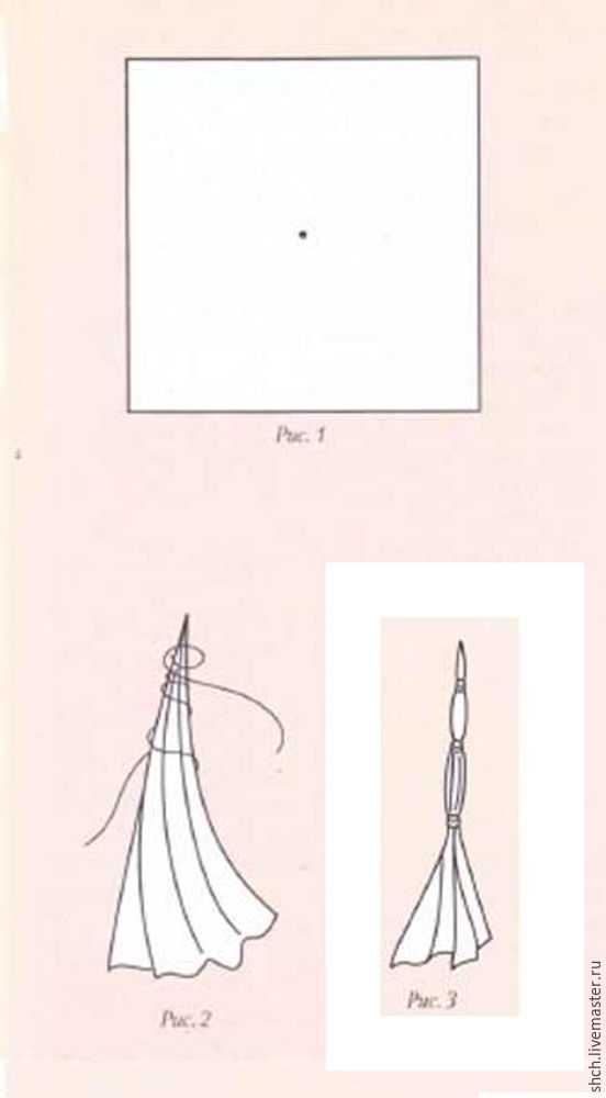 1. Возьмите салфетку за центр (рисунок 1), образуйте конус и начинайте затягивать ниткой конус от вершины к основанию (рисунок 2).