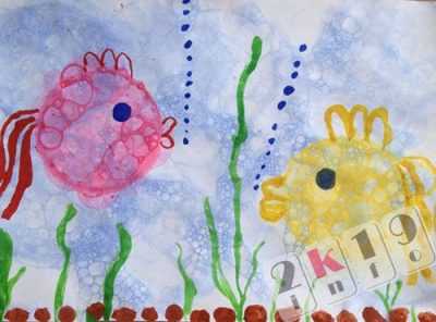 Ребенку будет очень интересно нарисовать картинку мыльными пузырями. Для этого в стакан с водой надо добавить любой мыльный раствор и краску и с помощью трубочки сделать крепкую пену. На пузыри аккуратно положить лист бумаги и дождаться, когда станут проявляться первые узоры. Можно поднимать бумагу — пузырчатые узоры готовы.
