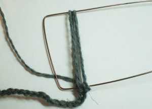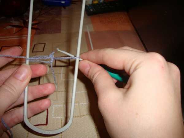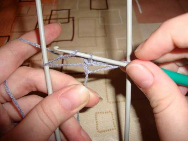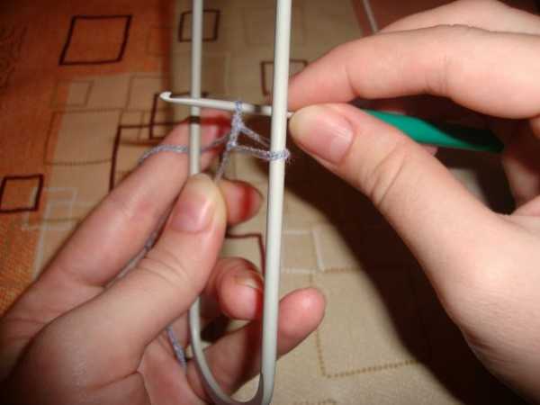 Шаг третий: захватываем нить и провязываем воздушную петлю. При вязании нужно стараться держаться по середине вилки, чтобы полоса вышла симетричная и красивая.