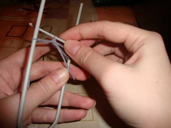Шаг второй: набрасываем рабочую нить на вилку(так как показано на фото — чтобы рабочая нить была за вилкой). Для удобства можно придерживать начало нити пальцами левой руки, прижимая ее к левому рожку вилки.