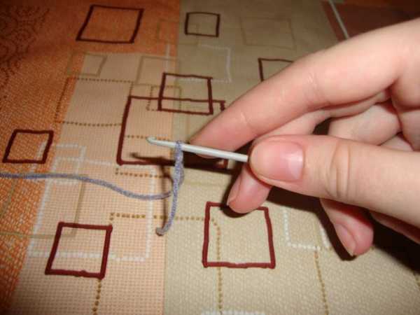 Первый этап вязания начинается с образования крючком воздушной петельки. Возьмите рабочий инструмент в правую руку, и заведите нить за вилку, с левой стороны. После этого протяните крючок к центру будущего полотна, подхватите нить, и сделайте петельку.