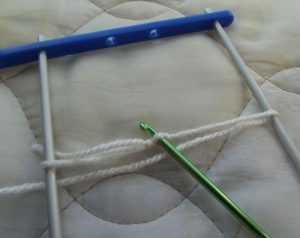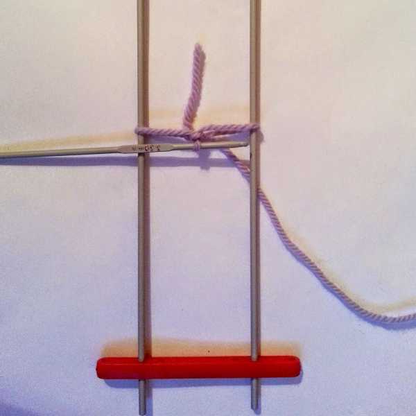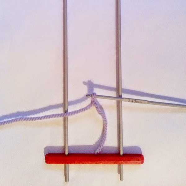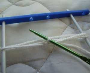 Инструменты имеют вид двух спиц, соединенных брусками, или U-образную форму. Для работы требуется крючок, размер которого зависит от толщины пряжи.