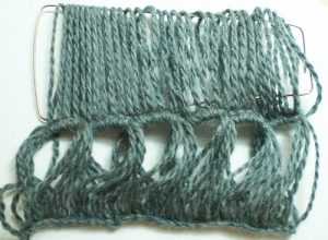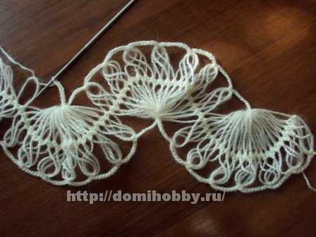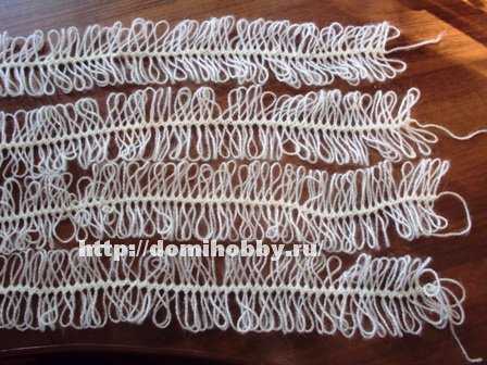 Повторяем раппорт с одной стороны полосы, а с другой начинаем провязывания стежками без накида из 21-вой длинной петли. Затем 8 воздушных петель, 7 раз стежки без накида из трех длинных петель, снова 8 воздушных петель. На схеме указана обвязка из шести воздушных петель, но мы сделали 8, так как из-за шерсти лента стягивалась.