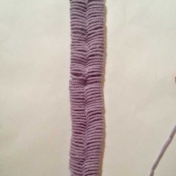 Для вязания палатина длиной 150 см и шириной 35 см подберите тонкую пряжу, 60% акрил, 40% мохер, вилку 8 см и крючок № 3. Выполняем 4 ленты на вилке, как описывалось в начале статьи. На каждой стороне должно быть 378 длинных петель. Ленты получаются длинными, если вам неудобно работать с такой длиной, делайте по 2 полосы. Их потом легко соединим. Далее полосы мы будем собирать веером, так что такая длина не будет заметна.