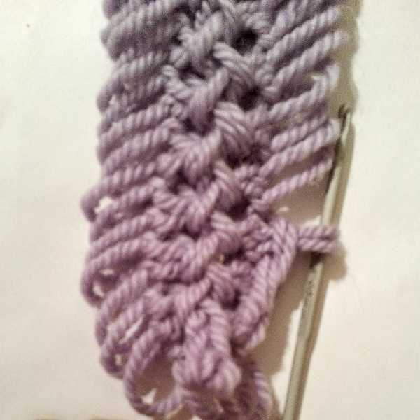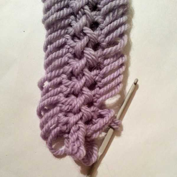 Поочередно провязывая по 2 петли с одной полосы через 2 петли с другой полосы, мы получаем вот такую конструкцию: Итоговый вид:
